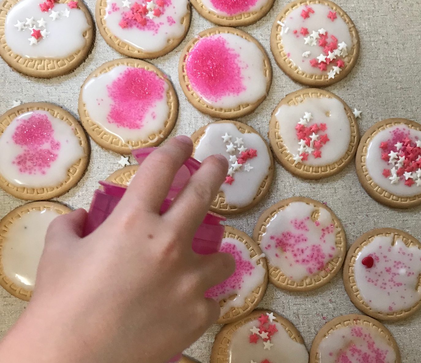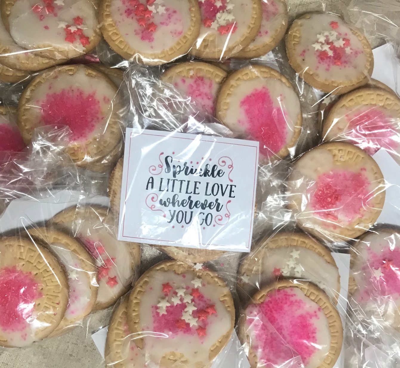 On Monday, Bella and I iced biscuits and covered them with pink sprinkles. We then packaged them into little bags with notes saying ‘Sprinkle a little love wherever you go’, and tied them with ribbons all ready for Valentine’s Day. This morning we spread a little love by handing them out to people on our way to school. It was so lovely, people’s faces lit up and Bella even got a few hugs.
